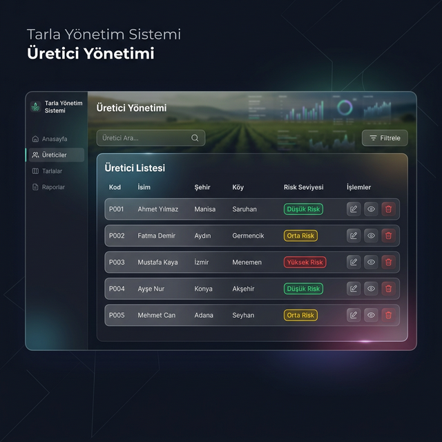 Detaylı üretici profilleri, dinamik özel alanlar ve toplu Excel yükleme ile binlerce üreticiyi kolayca yönetin.